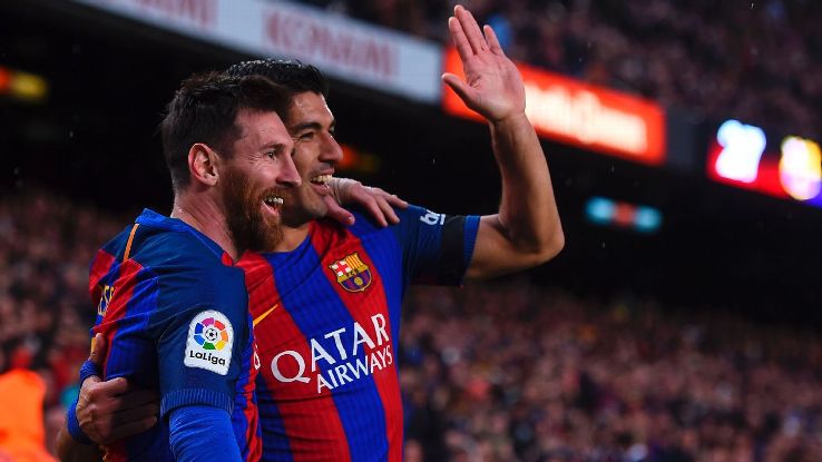 Suarez akiwa na Messi wakishangilia ushindi